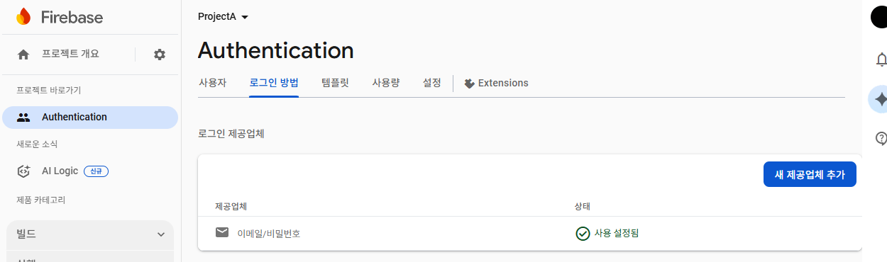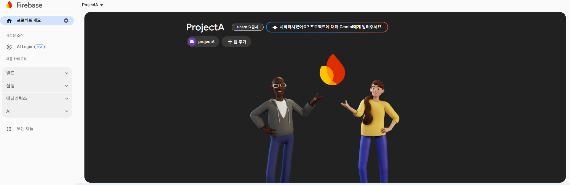 Firebase에 "projectA"라는 명으로 앱을 등록시켜 주어