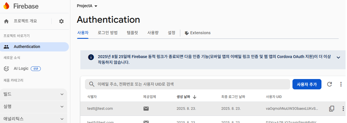 영상 후 Forebase의 Authentication > user 의 모습