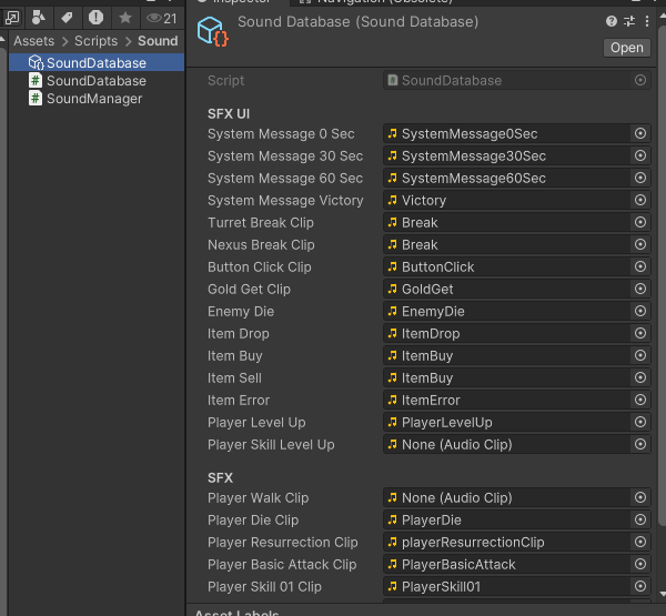 이름은 SoundDatabase로 짓고 에디터 메뉴에서의 경로는 Sound/SoundDatabase로 지어주었습니다.