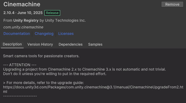 먼저 Virtual Camera를 사용하기 위해 Cinemachine을 설치해 주었습니다.