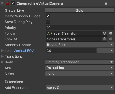 Framing Transposer를 설정해 주어 플레이어를 부드럽게 따라가게 해 주었습니다.
